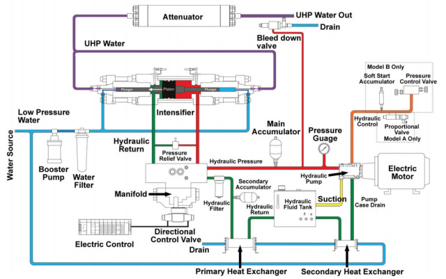 at dual cutting heads using one pump. For example, a 60,000 psi intensifier pump